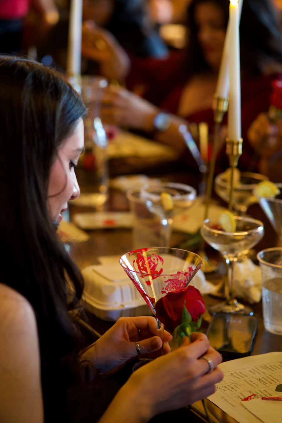 Guests arrived dressed in black and red, setting the tone that felt both elegant and vibrant. With roses hanging from the ceiling and candlelit tables throughout the room, the atmosphere was warm, inviting, and full of energy from the moment guests walked in.Throughout the evening, attendees enjoyed cocktails, shared appetizers, and a full dining experience while conversations naturally flowed from table to table. Friends arrived together, but the night quickly expanded beyond familiar circles as women introduced themselves, shared stories, and found common ground.